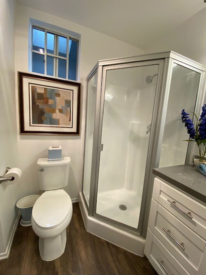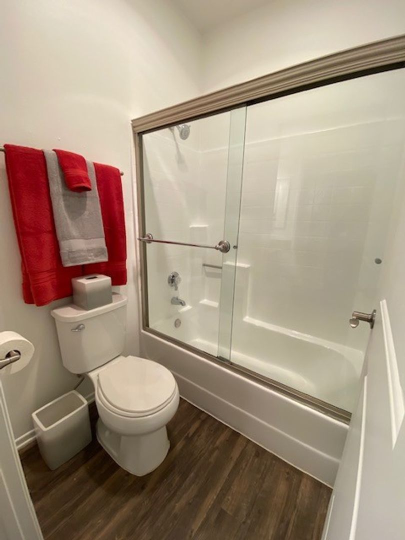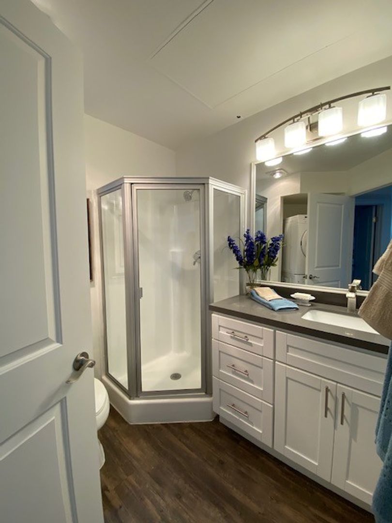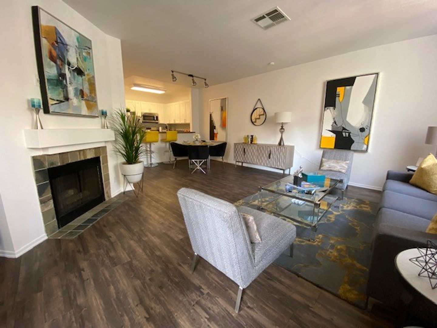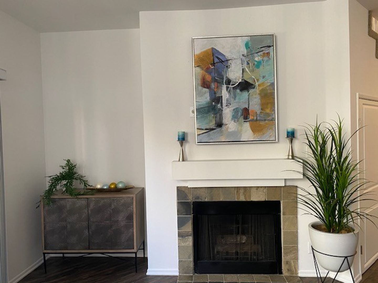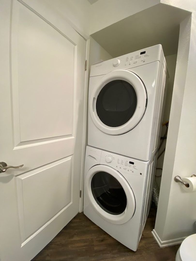 Spacious 2-level townhome with W/D in unit, 2 parking spaces, fireplace, and private patio. Renovated, featuring SS appliances, quartz counters, and hardwood laminate flooring.